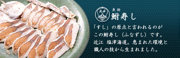 近江(淡海)の国は湖国と呼ばれています。母なる湖琵琶湖は湖の幸を周辺の住民にもたらしました。今でも 貝塚等が湖国のあちこちに散見でき湖の恵みが物語れています。 またこの地は、古くは天智天皇の近江京、織田信長の安土城など多くの歴史と文化を育んできました。 今日でも、すしの原点と言われている「鮒すし」を初め、江戸時代よりの伝統である「近江牛」、鮎や鯉、しじみ、 もろこなどの湖の幸など豊富な食の宝庫として知られています。 魚助の取扱商品には季節限定の商品もございますが、びわこ産、鮒寿し、小鮎(こあゆ)のしょうゆ煮、えび豆煮、 鯉のうま煮、そして、鯖寿しなどです。 魚助自慢の琵琶湖特産、鮒すしを琵琶湖の風景に思いを馳せながらぜひ、ご賞味ください。 |